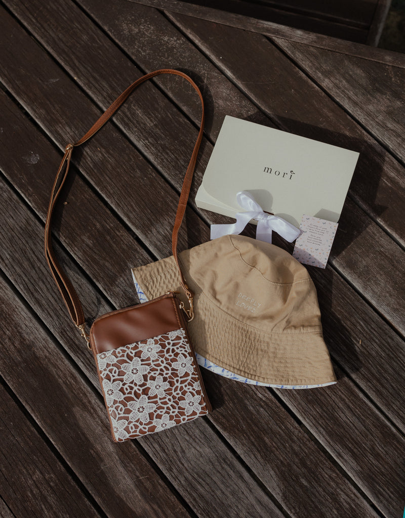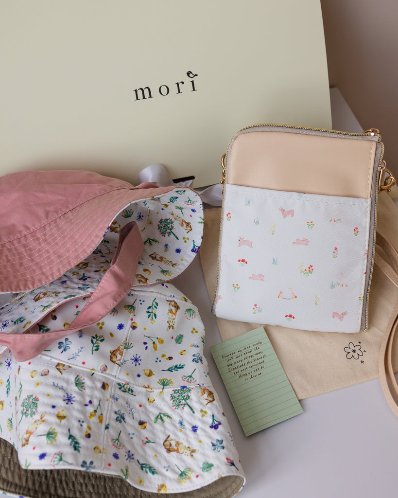 Dual Zip Sling Bag + Reversible Bucket Hat for Baby/Toddler and Mom + Free 1 x Name Embroidery + Ribbon Mori Packaging