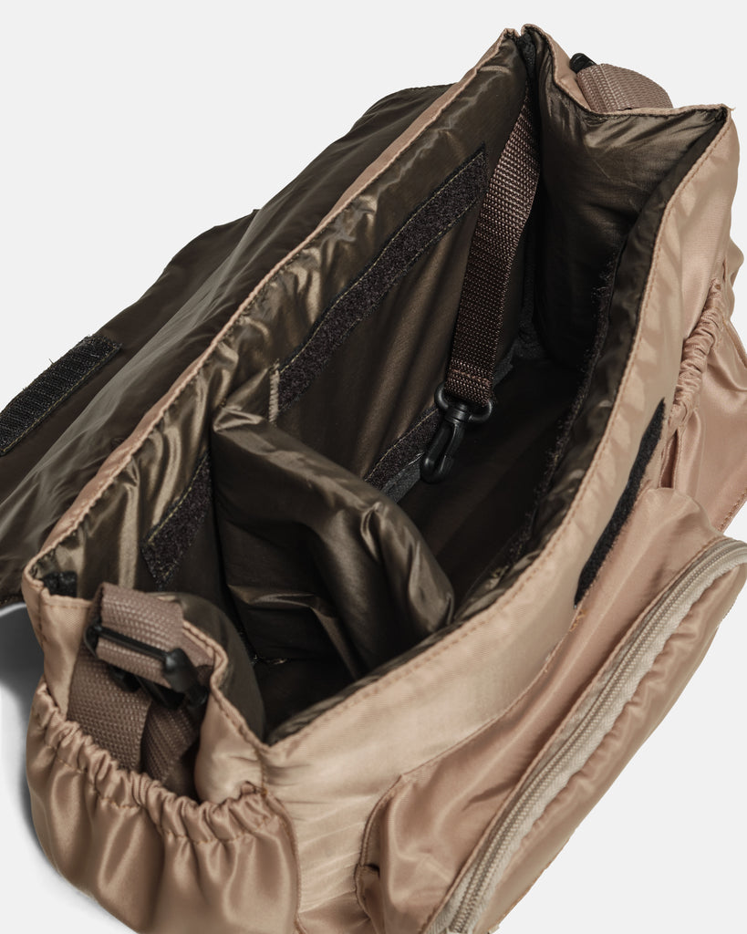 - Spacious body compartment w movable divider and velcro closure