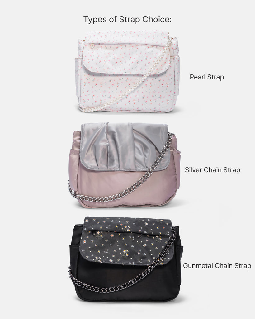 Select pearl, silver chain or gunmetal chain to pair with your Multi-Carry Crossbody Bag ;-) We have included our recommended pairing in product photo for your reference! If you wish to add on another design for chain strap, reach out to us at hello@moriofficial.com.