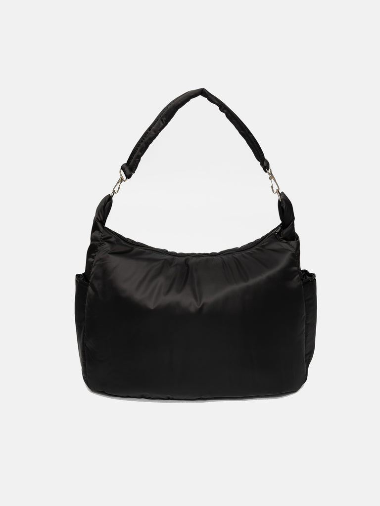 A wide shoulder strap ensures easy carrying — even with a laptop. Matte silver D-rings let you personalise with your favourite bag charms, while the curved hobo silhouette keeps it chic and easy to wear, day in and out.