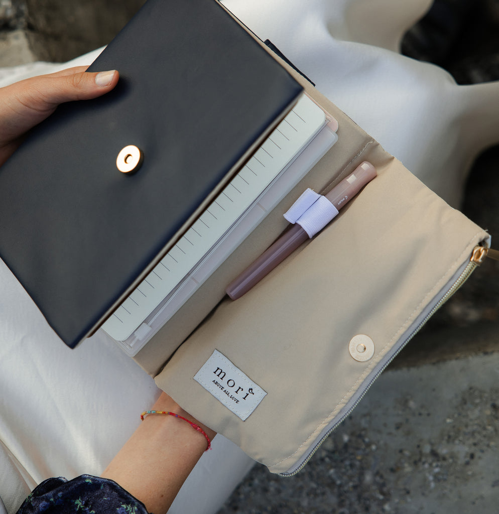 A one-of-a-kind creation by Mori, the Pursebook redefines what a notebook can be. It's designed with a functional built-in purse to effortlessly carry your stationery or phone in one elegant package. Whether for work, school or spontaneous moments of inspiration, you're always prepared to capture your thoughts anytime and anywhere.
