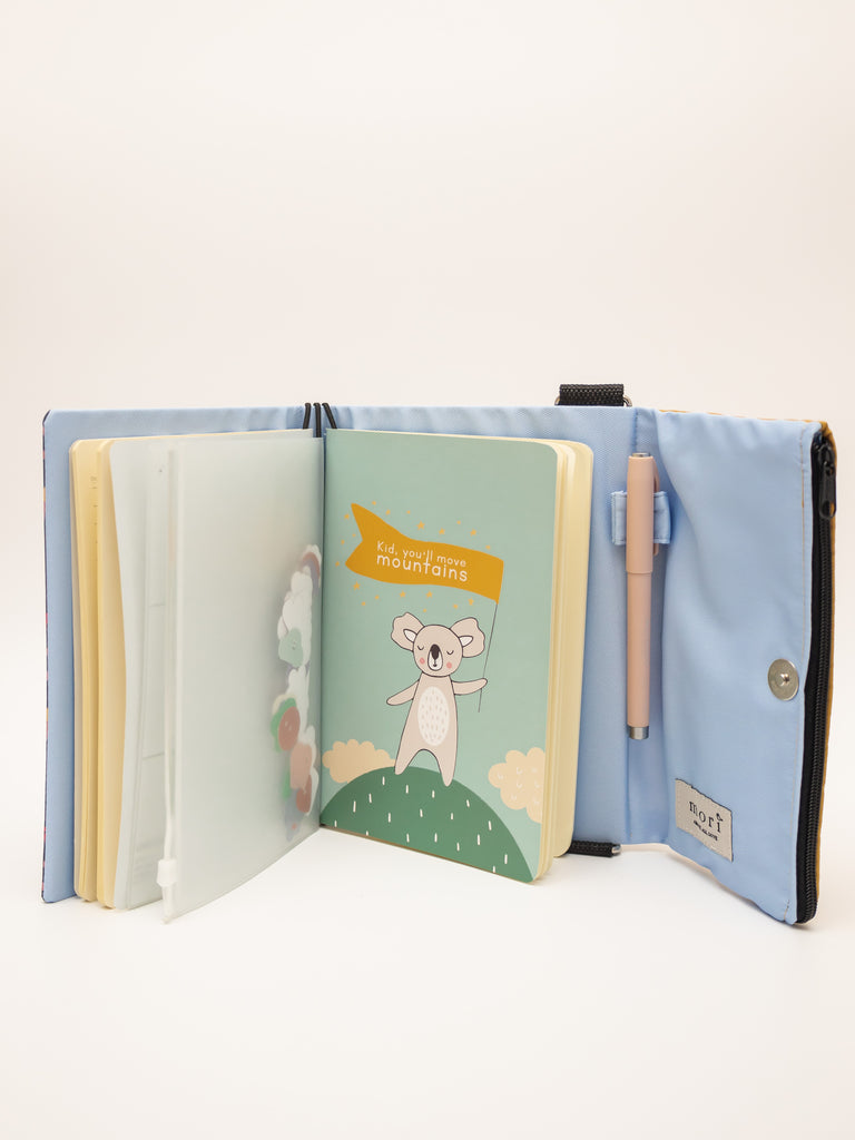 An original creation, Mori's World's 1st Portable Doodle Bag for Kids blends function of notebook and pencil case together. No more scrambling for several items notebook, pencil case, stickers when going on adventures with your little ones!