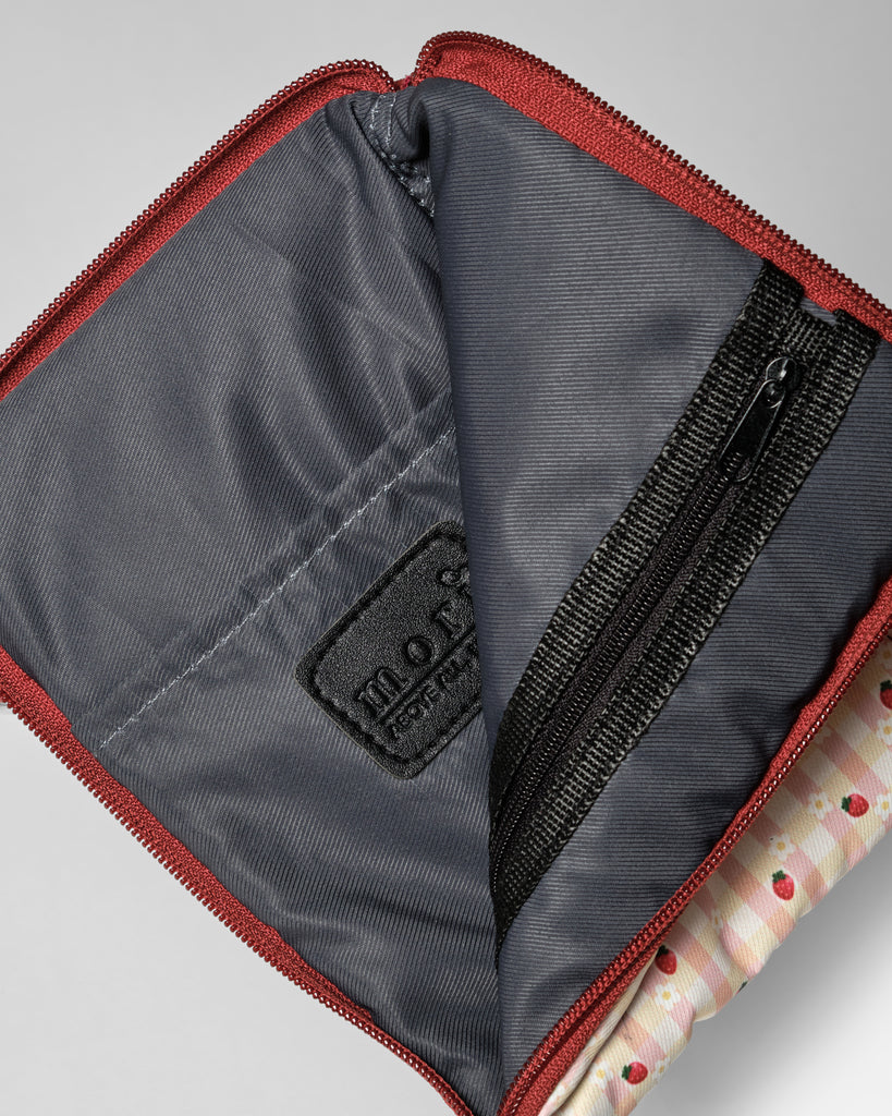 You can wipe with wet wipes since the bag is made of water-resistant fabric and vegan leather (except only for denim design).